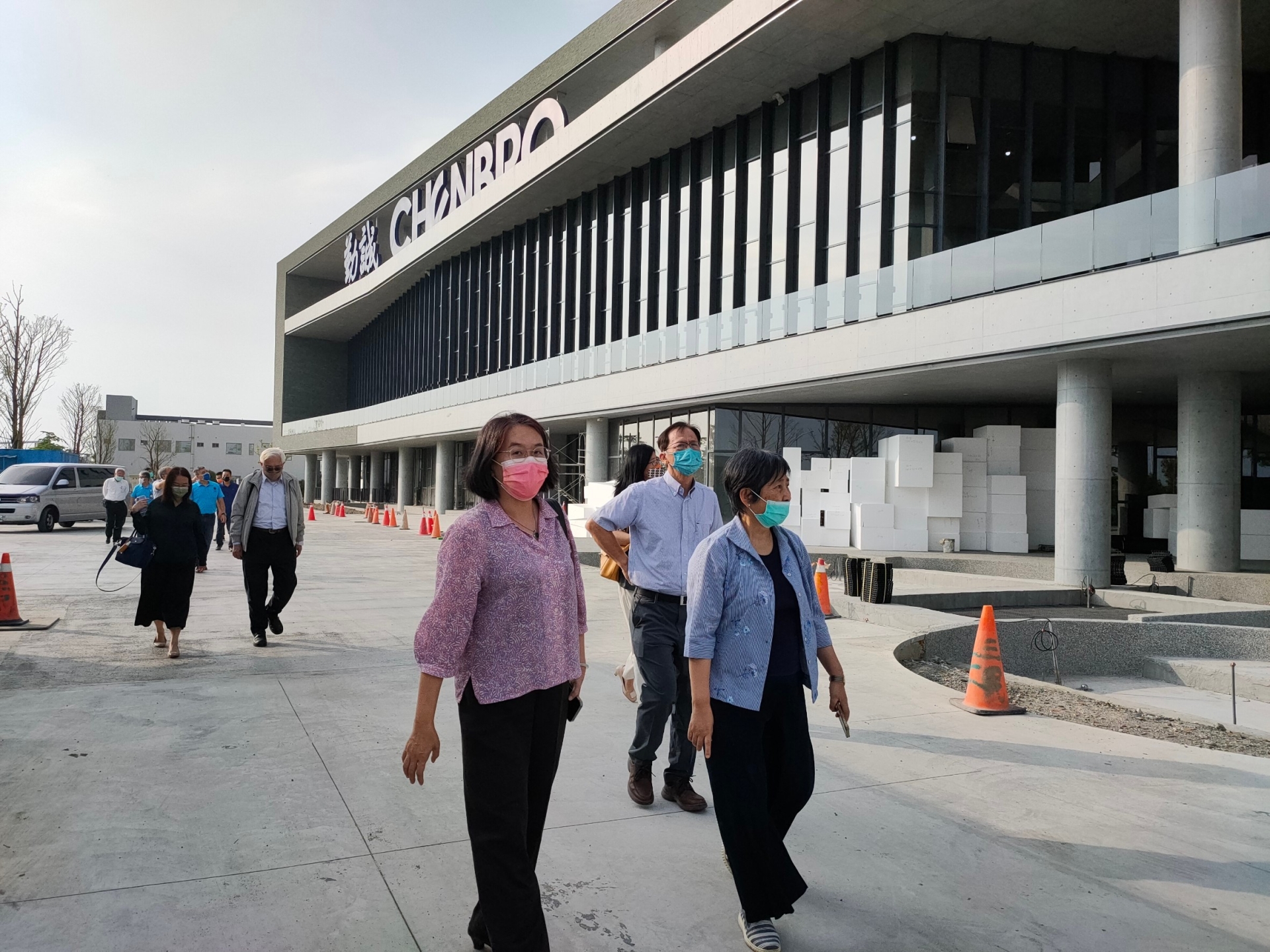 ►(圖一)陳美琪董事長帶領雲科大團隊參觀廠區外部景觀設計。