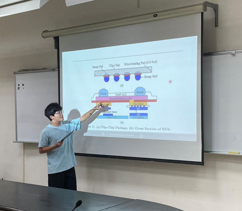 ►圖中為實驗室同學討論封裝內跳脫佈線策略的情形,交流在不同封裝結構下(如 BGA 與 CSP)可能面臨的佈線瓶頸與解法。我們也延伸探討如何結合自動化與強化學習技術,以模擬工程師的決策過程並最佳化佈線結果。