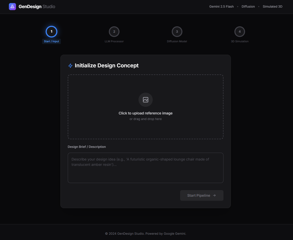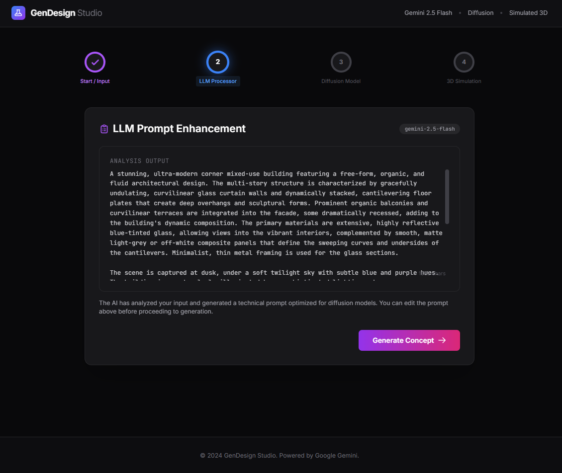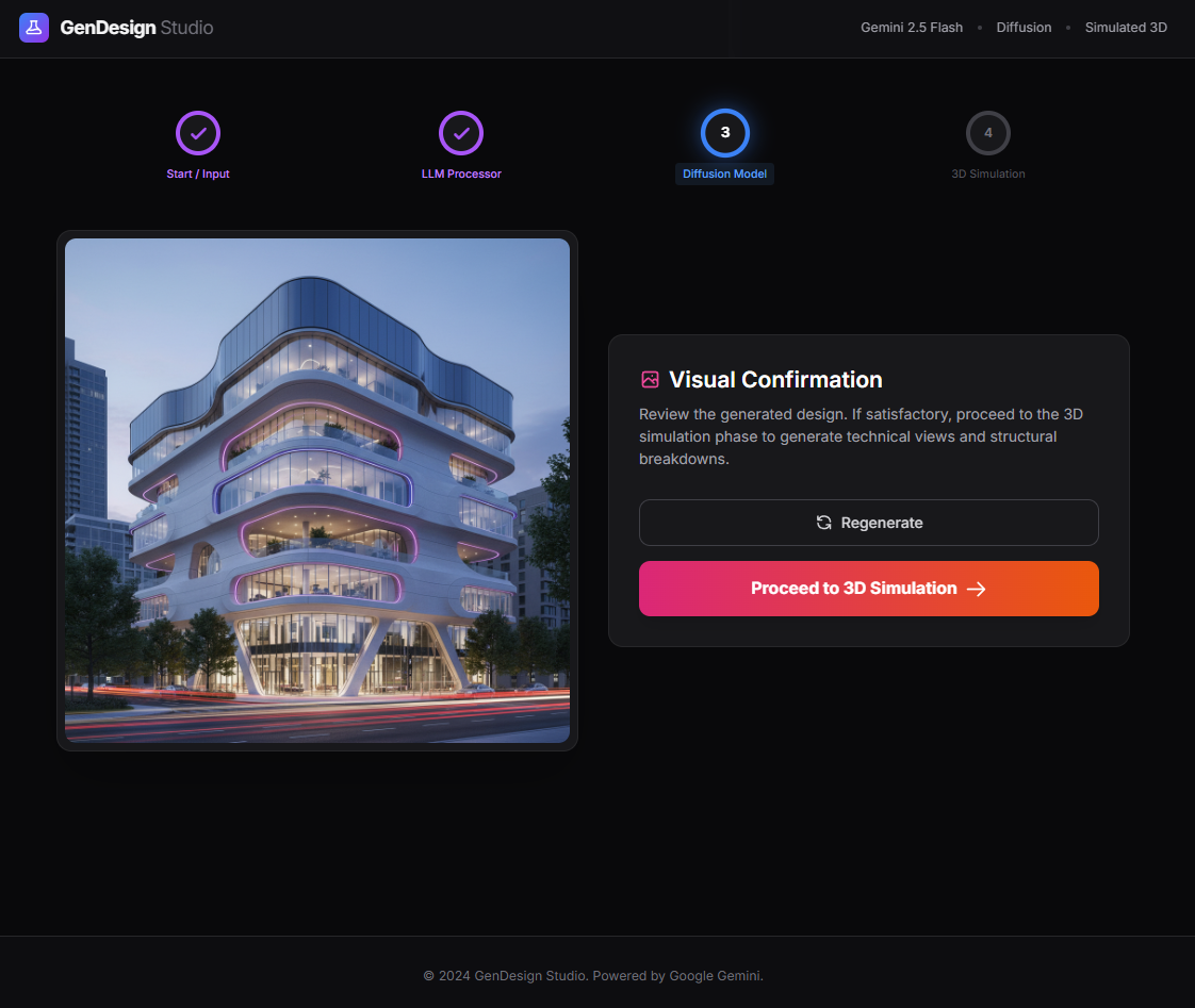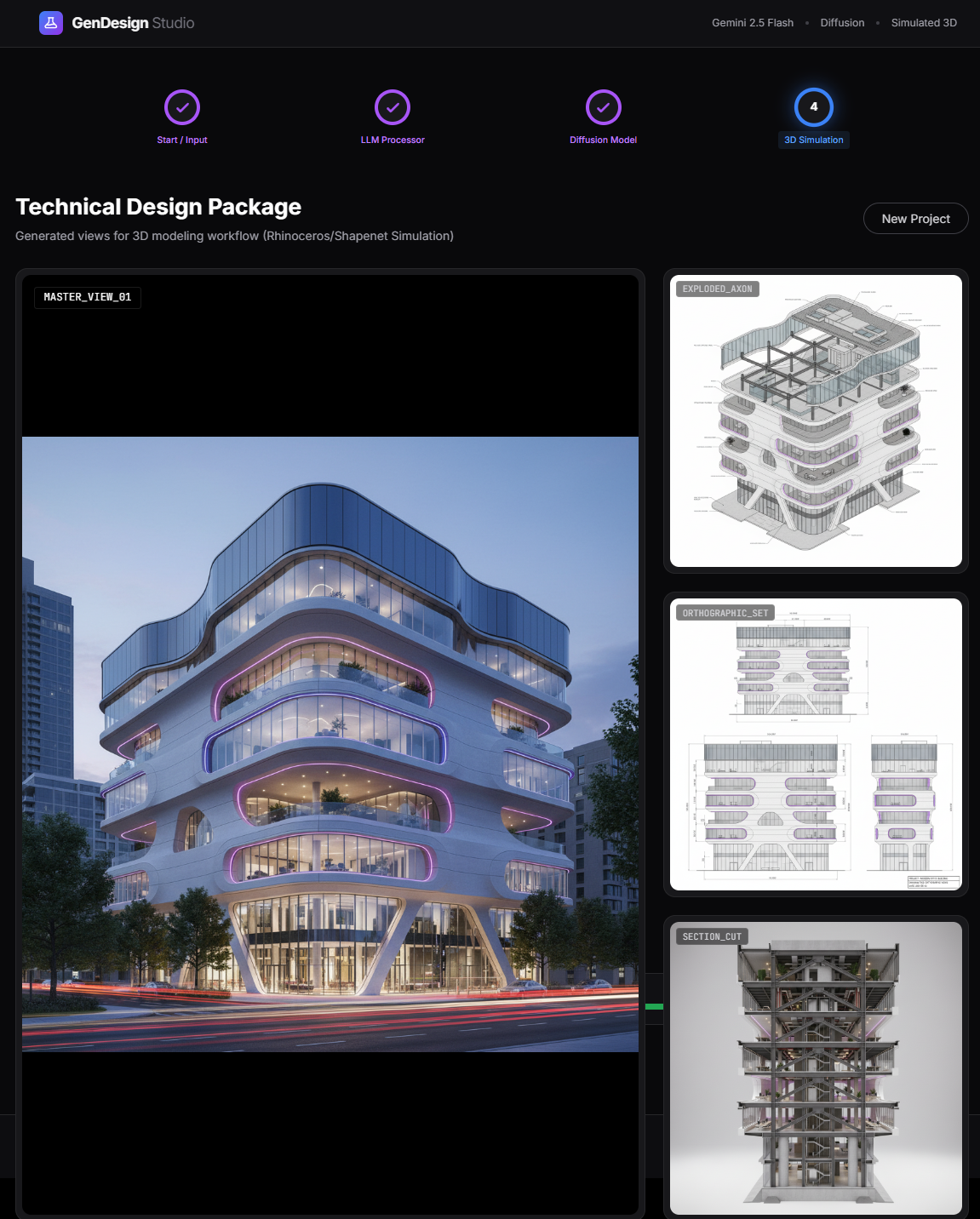 本項目提出了一套名為「GenDesign Studio」的創新設計工作流,透過整合大型語言模型(LLM)與擴散模型(Diffusion Models),旨在彌合抽象設計概念與具體技術實踐之間的鴻溝。 平台的核心優勢在於能夠理解多模態輸入,將設計師提供的參考圖像與文字提示(例如:「Zaha Hadid style corner mixed-used architecture」)進行語意對齊。在工作流的第一階段,系統利用 LLM CLIP Interrogator 解析輸入圖像的視覺特徵,並透過 LLM Prompt Generator 優化提示詞,精準引導 Diffusion Model 生成高品質的二維建築視覺預覽。此階段設有回饋機制(Feedback Loop),設計師可透過「Visual Confirmation」介面反覆迭代,直至生成滿意的方案,確保設計意圖的準確傳達。 一旦視覺方案確認,系統即進入關鍵的「三維模擬(3D Simulation)」階段。透過整合 Rhinoceros 3D Modelling 與 Shapenet 生成技術,平台能自動將二維圖像轉譯為具備幾何深度的三維模型。在此過程中,系統會自動執行嚴格的技術檢核,包括幾何形態(Geometry)、材料屬性(Materials)、光影分析(Lighting)以及物理模擬(Physics Check),確保生成的模型不僅具備視覺美感,更符合物理真實性。 最終,GenDesign Studio 能自動產出完整的「技術設計套圖(Technical Design Package)」。如截圖所示,輸出內容涵蓋了渲染主圖(Master View)、展示空間結構的爆炸軸測圖(Exploded Axon)、標準的正投影圖組(Orthographic Set),以及詳細的剖面透視圖(Section Cut)。這套流程大幅縮短了從概念草圖到技術圖紙的轉換時間,讓空間設計能夠迅速進行生成、模擬與修改,極大化地提升了方案發展的效率與設計創意的展現。